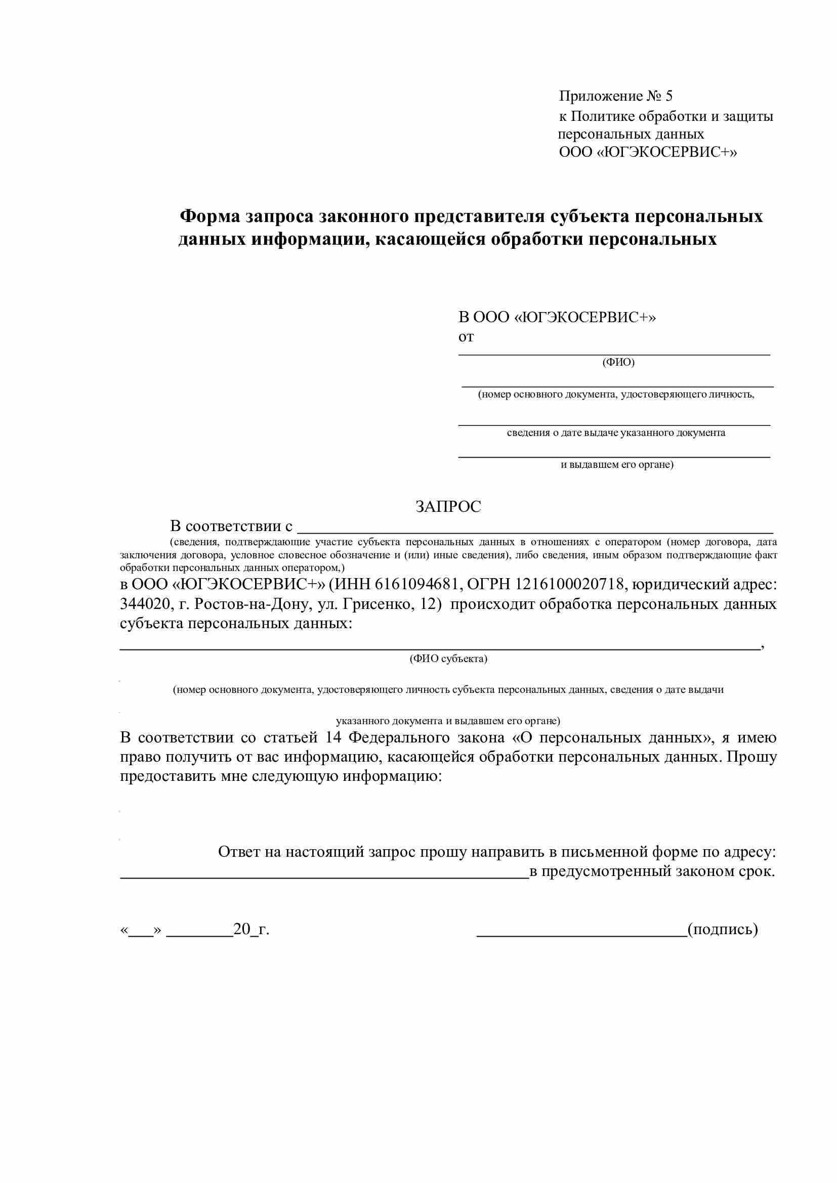 6.8. Для получения необходимой информации, касающейся обработки персональных данных, описанной в пункте 6.5.1. настоящей Политики, Субъекту (либо законному представителю) необходимо заполнить соответствующую форму запроса субъекта персональных данных информации, касающейся обработки персональных данных (приложение 1 или 5) и передать лично работникам ООО «ЮГЭКОСЕРВИС+», принимающим обращения граждан, либо по почте.